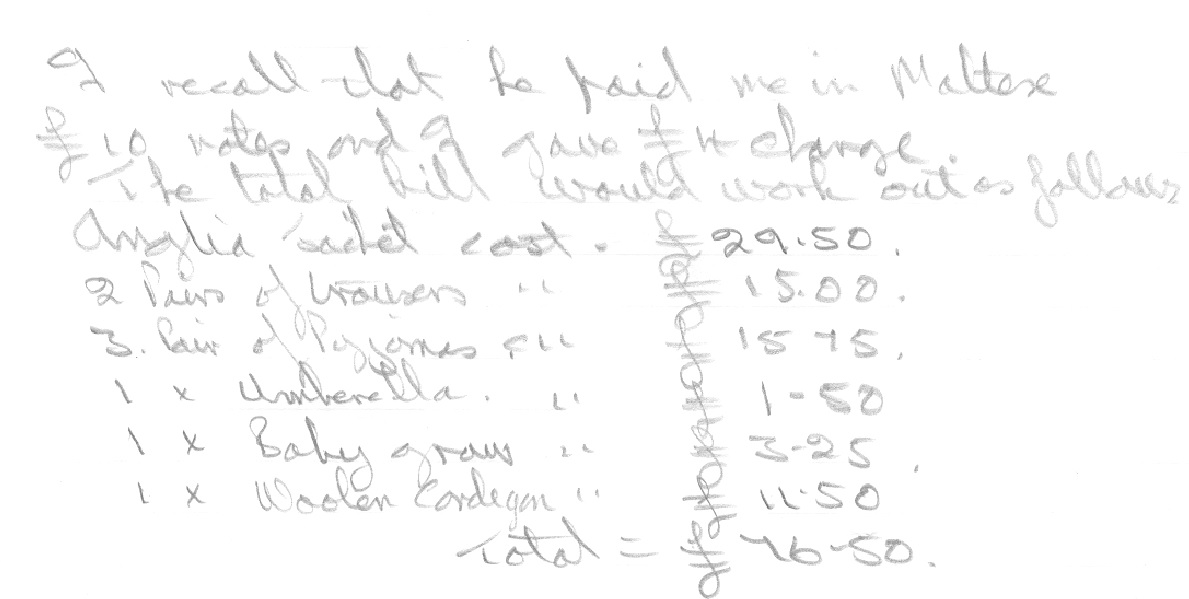 During his first interview, Gauci told DCI Bell that he remembered that the bill amounted to 76.5 Maltese pounds (LM). Gauci even clearly remembered that the man paid him with eight 10 LM bills, and that he returned 4 LM as he was not able to give a half pound in change.