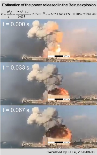 This result is also in good agreement with the seismic magnitudes recorded. [The United States Geological Survey reported a 3.3 magnitude for the Beirut explosion. Others have reported higher values. The UC Berkeley Seismology Laboratory measured mb=3.4 and the German Research Centre for Geosciences, GFZ obtained mb=3.5.]