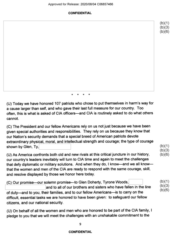“Good morning, and welcome everyone. We are gathered here this morning to honor 107 extraordinary women and men from throughout our Agency’s history beloved colleagues who will inspire us forever with their unsurpassable devotion to duty and country. We also celebrate the lives of the four men whose stars were added to our Memorial Wall in the past year: Glen Doherty, Tyrone Woods, [REDACTED] [REDACTED].”