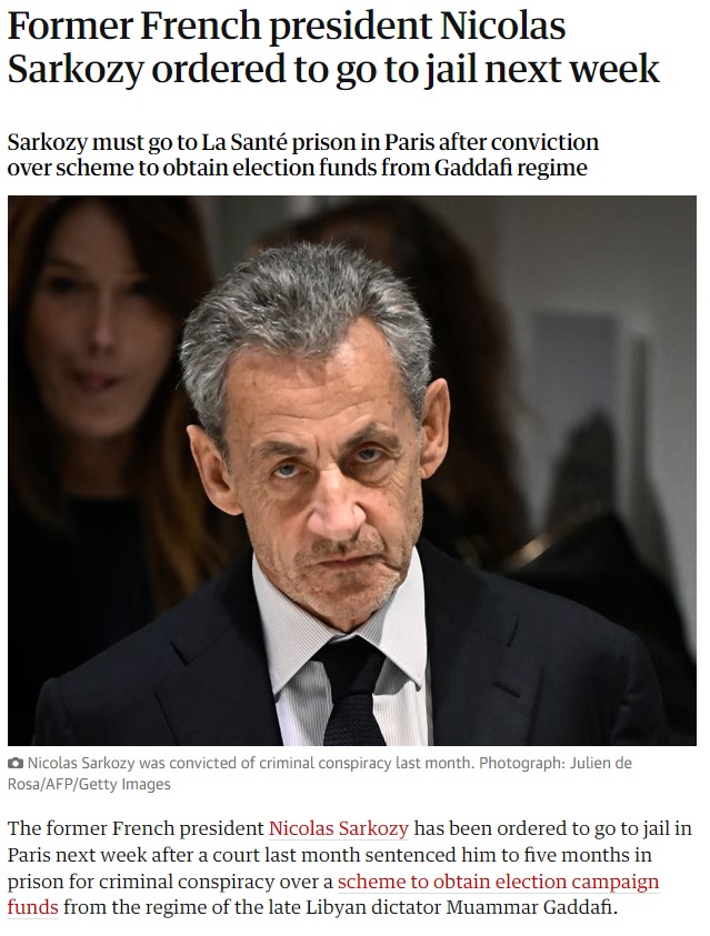 “The former French president Nicolas Sarkozy has been ordered to go to jail in Paris next week after a court last month sentenced him to five months in prison for criminal conspiracy over a scheme to obtain election campaign funds from the regime of the late Libyan dictator Muammar Gaddafi.”